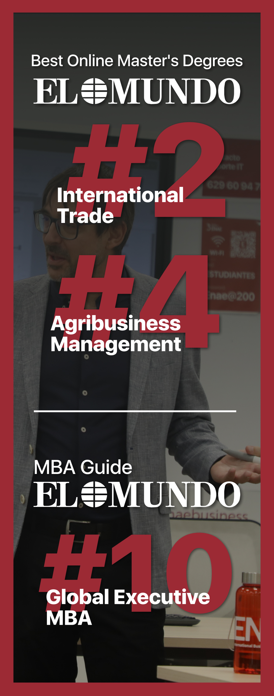 The Master's Degree in Agribusiness Management from ENAE Business School ranks 4th in El Mundo's ranking of Best Online Master's Degrees, consolidating its position as a benchmark in advanced training in sustainable agribusiness.