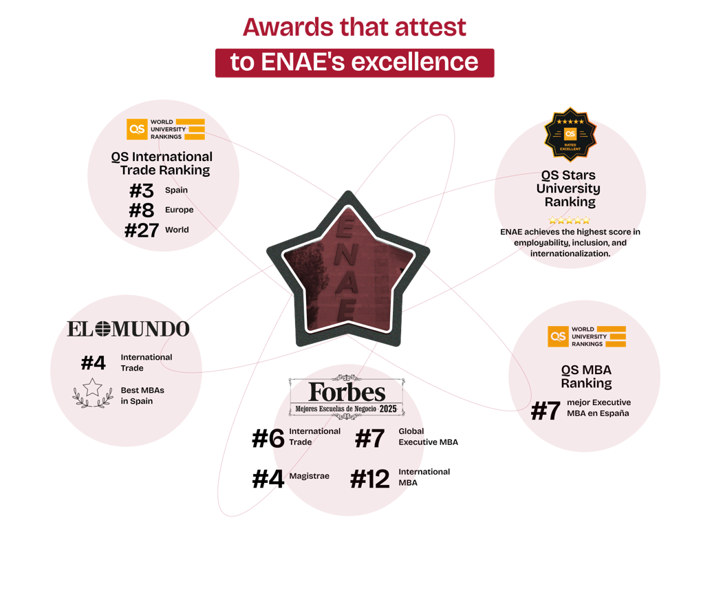 The QS International Trade Ranking evaluates the best MBA and master's programs specializing in international trade globally. In its latest edition, ENAE's Master in International Trade has been ranked as: 3rd best master's degree in Spain, 8th in Europe, and 27th worldwide.